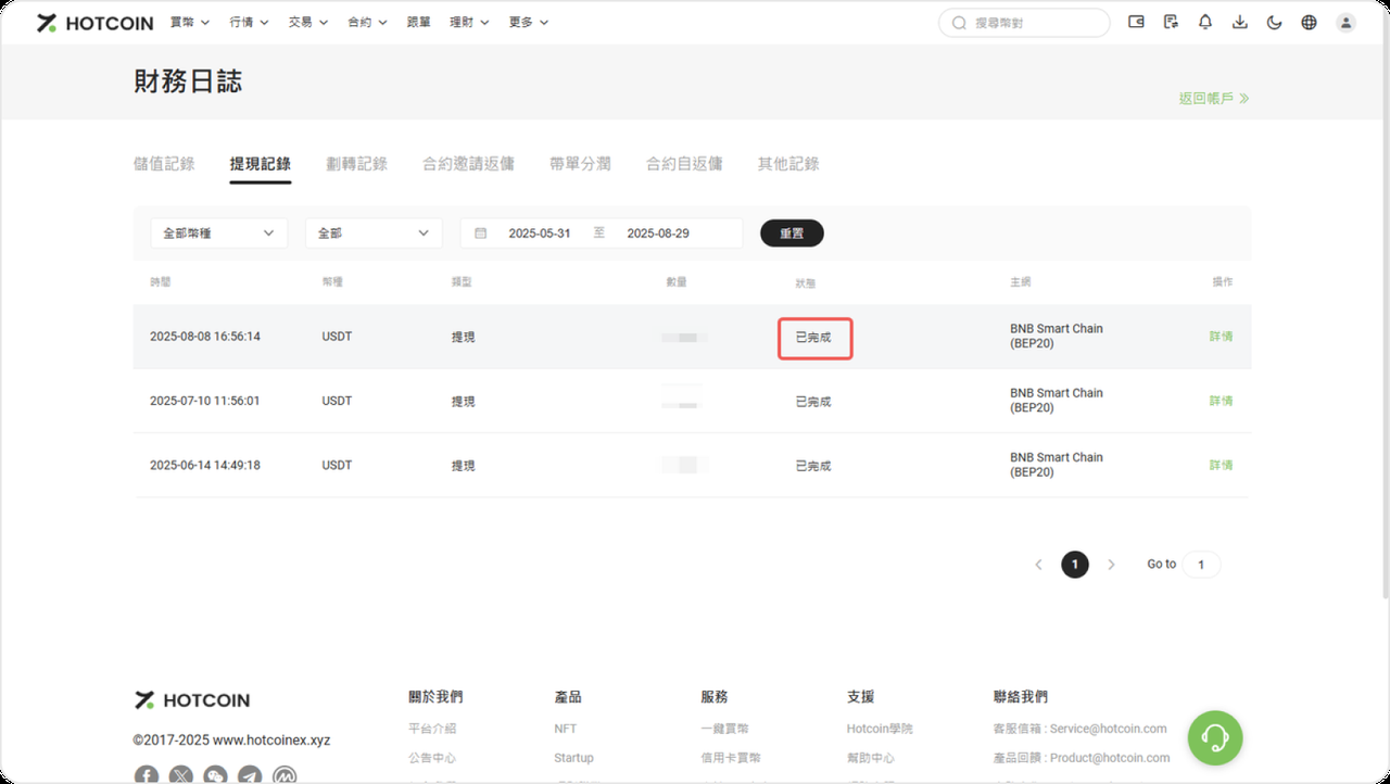 若交易狀態顯示為 「已完成」,但仍未在錢包中看到資金,請再次確認收款地址或帳戶資訊是否正確。